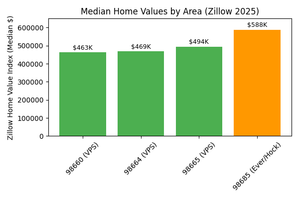 Local Zillow data illustrate the split. In zip code 98660 (central Vancouver, Vancouver Public Schools territory), the typical home value is roughly $463K (www.zillow.com). Head east into Evergreen or Hockinson school zones (e.g. zip 98685), and Zillow’s Home Value Index jumps to $588K (www.zillow.com) – about a 27% premium. Even within Vancouver, neighborhoods in better-rated districts command higher prices. For example, salmon-Creek area zip 98665 (service area for unpredictable school rankings) has a median ~$494K (www.zillow.com), compared to $453K (www.zillow.com) in adjoining zip 98661. In short, homes in Vancouver School District tend to run roughly $450K–500K, while houses in much of the Evergreen/Hockinson zones run closer to $540K–590K. (We’ve flagged these differences in the chart below.)