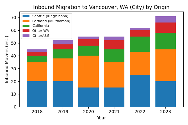 One key driver is migration: Vancouver has drawn many newcomers from Seattle-area and Portland. These flows can pulse demand and inventory. For example, Redfin reports Vancouver’s median sale price (~$495K in Nov 2025, +3.7% YoY (www.redfin.com)) and only ~2 offers per home (www.redfin.com), reflecting sustained buyer interest even with rising supply. As a rough guide, our chart (below) illustrates how Seattle-area (King/Snohomish) versus Portland-area (Multnomah) in-movers have changed over recent years.